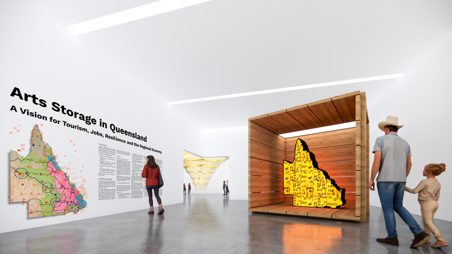 The Queensland Governments Arts Storage project needs to be rethought, not as a centralised storage facility in Brisbane, but as a series of exhibition spaces, tourist attractions and smaller storage facilities, spread throughout the regions. In reframing the project we can reduce costs, attract both federal funds and regional support (in the form of land), grow tourism, increase skills, reduce risk, create jobs and free up lost exhibition space in our most important gallery/museum and library spaces.