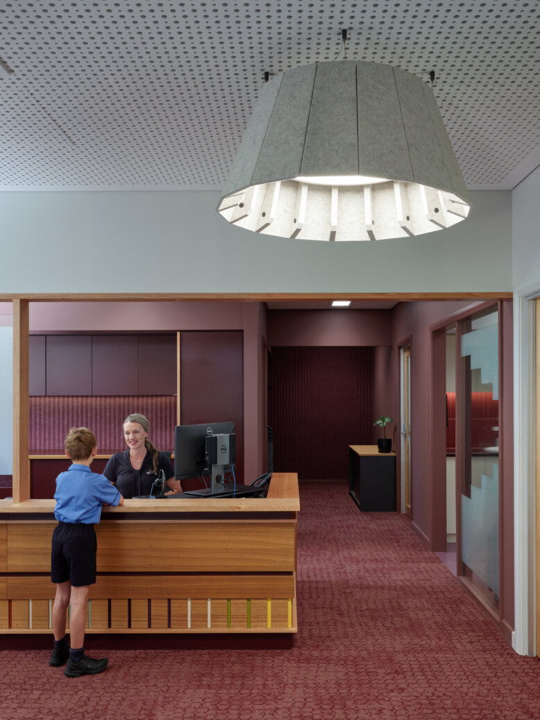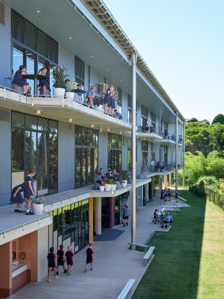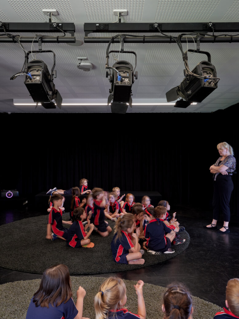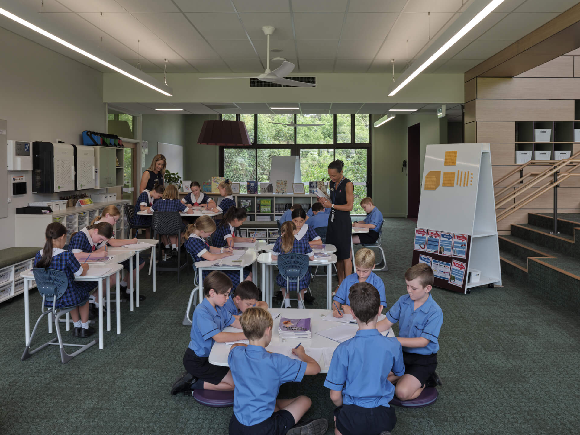 The new primary school building facilitates and fosters a co-teaching pedagogy through an innovative arrangement of interconnected learning environments. The new wing accommodates a 3-stream year 1-6 primary school across 3 storeys. The 6 years are organised into 3 stages – year 1-2, year 3-4, and year 5-6. In each stage, 150 students are educated in a varied spatial environment that is deftly arranged to provide a series of learning modes suited to individuals, groups of all sizes, entire year cohorts, and whole stage gatherings. There are bleachers, kitchens, maker spaces, lounges, nests, an art studio, and spaces with flexible furniture, to provide for all modes of learning enquiry and tuition. Whilst openly connected, the spaces and surface finishes manage acoustics and privacy for the benefit of all students and teachers.