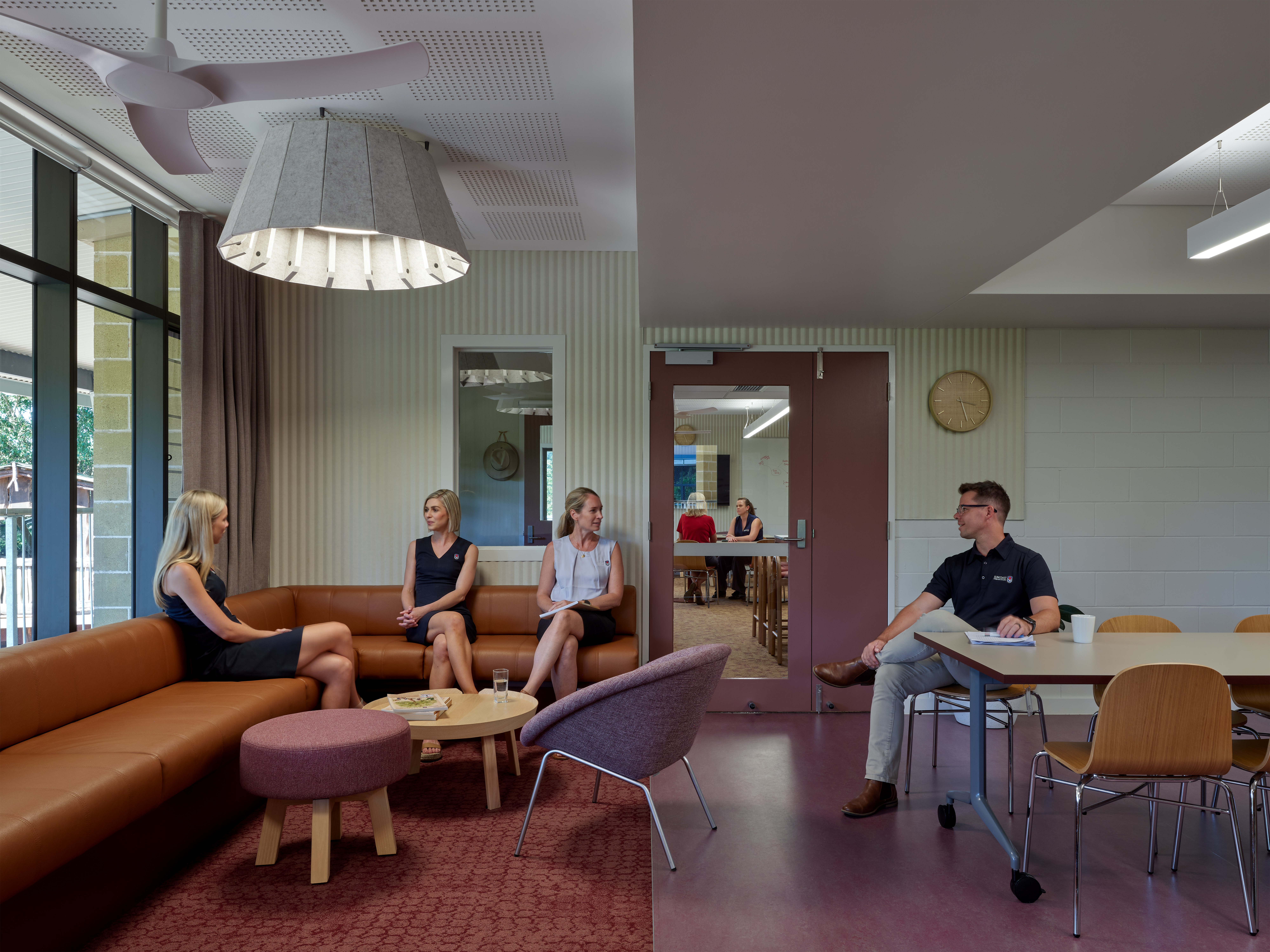 The design references the agricultural heritage of Woombye, and the College as the site of an old pineapple farm. The form of the building takes cues from rational glass houses and shade houses – a long rectangular building with perfect orientation for natural light and air, and a sense of transparency to allow this unique learning setting to be outward looking and equally seen by the community. The materiality and naming of each stage responds to each season (summer for prep, autumn for year 1-2, winter for year 3-4, spring for year 5-6), providing a unique identity for each stage. The material palette is graded to transition from the vibrancy of the active play spaces on ground up into the various calm settings for learning on the upper levels.